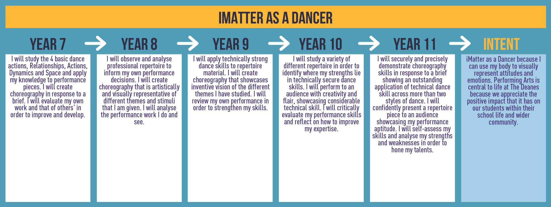 Students will study the dance styles of a variety of pop bands through the ages, identifying similarities and differences. Students will study the choreography and replicate the performance showing an understanding of repertoire. | Students will be able to accurately and confidently perform movements and demonstrate an appreciation of the different styles studied. | The quality of the students' dance performances will be assessed through the accuracy of their performance. Students' appreciation of performance will be assessed through written evaluations/logbooks each lesson. |
